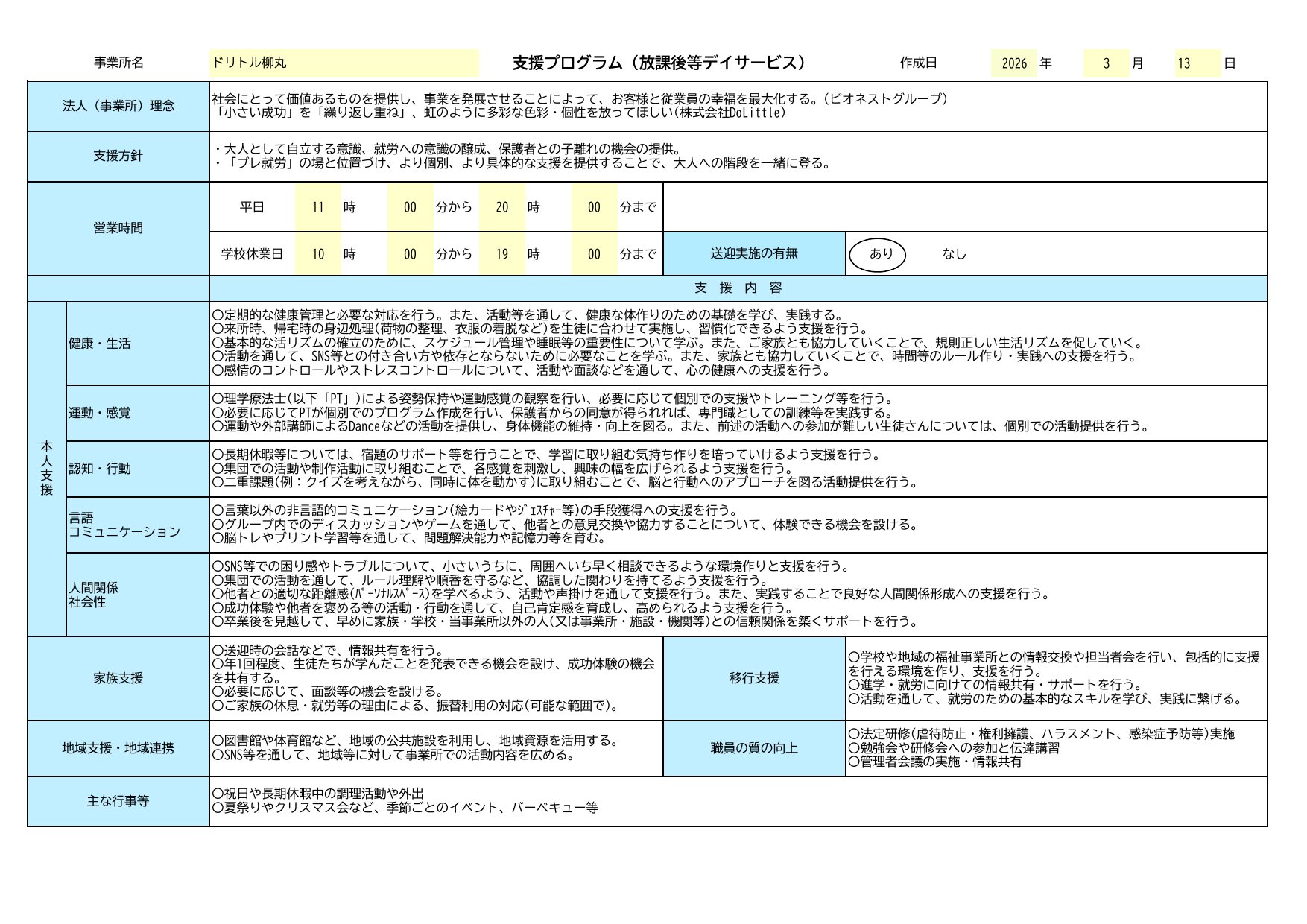 | サービス提供時間 | 午前10時〜午後6時 長期休暇中は午後17時までサービス提供 |