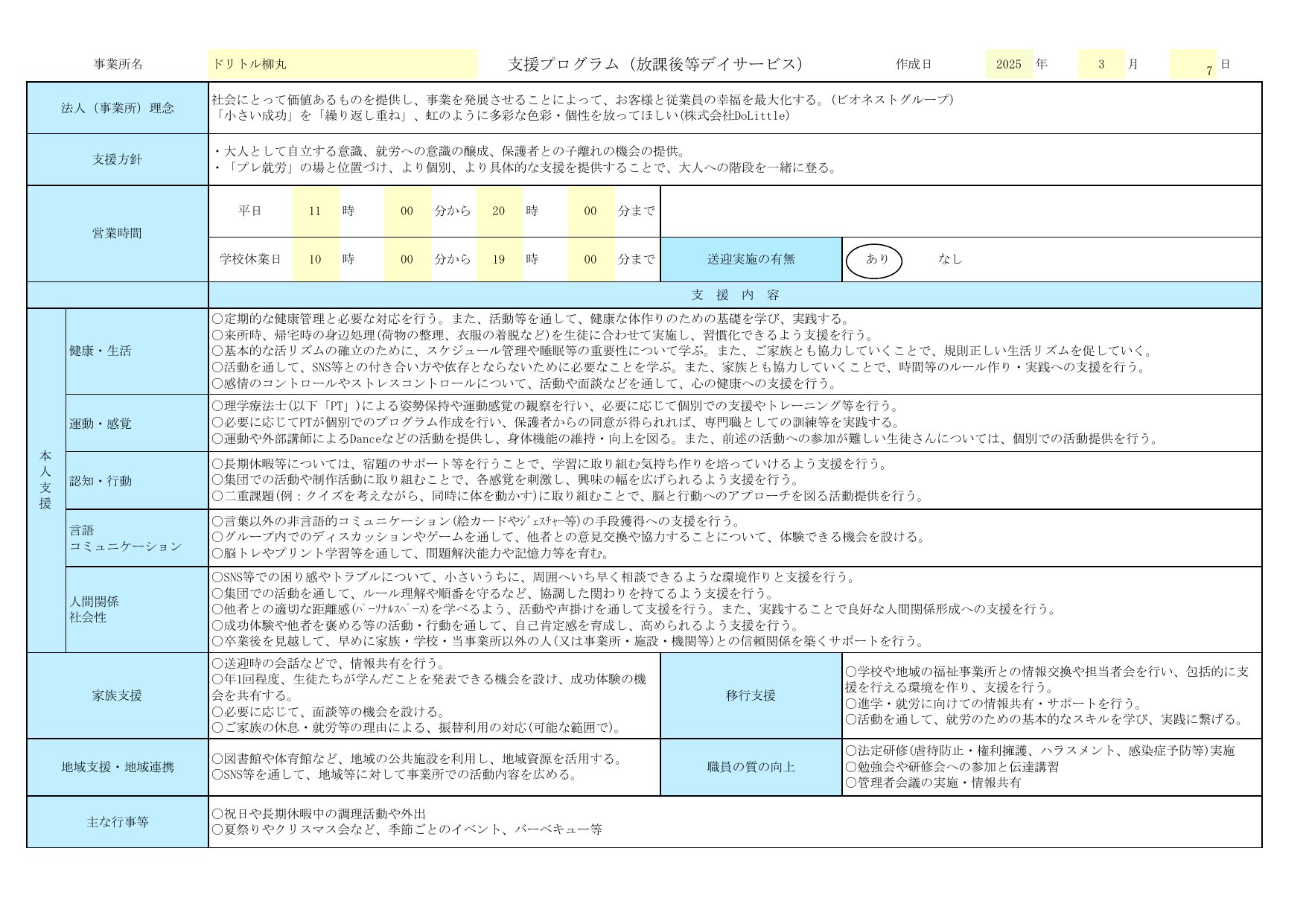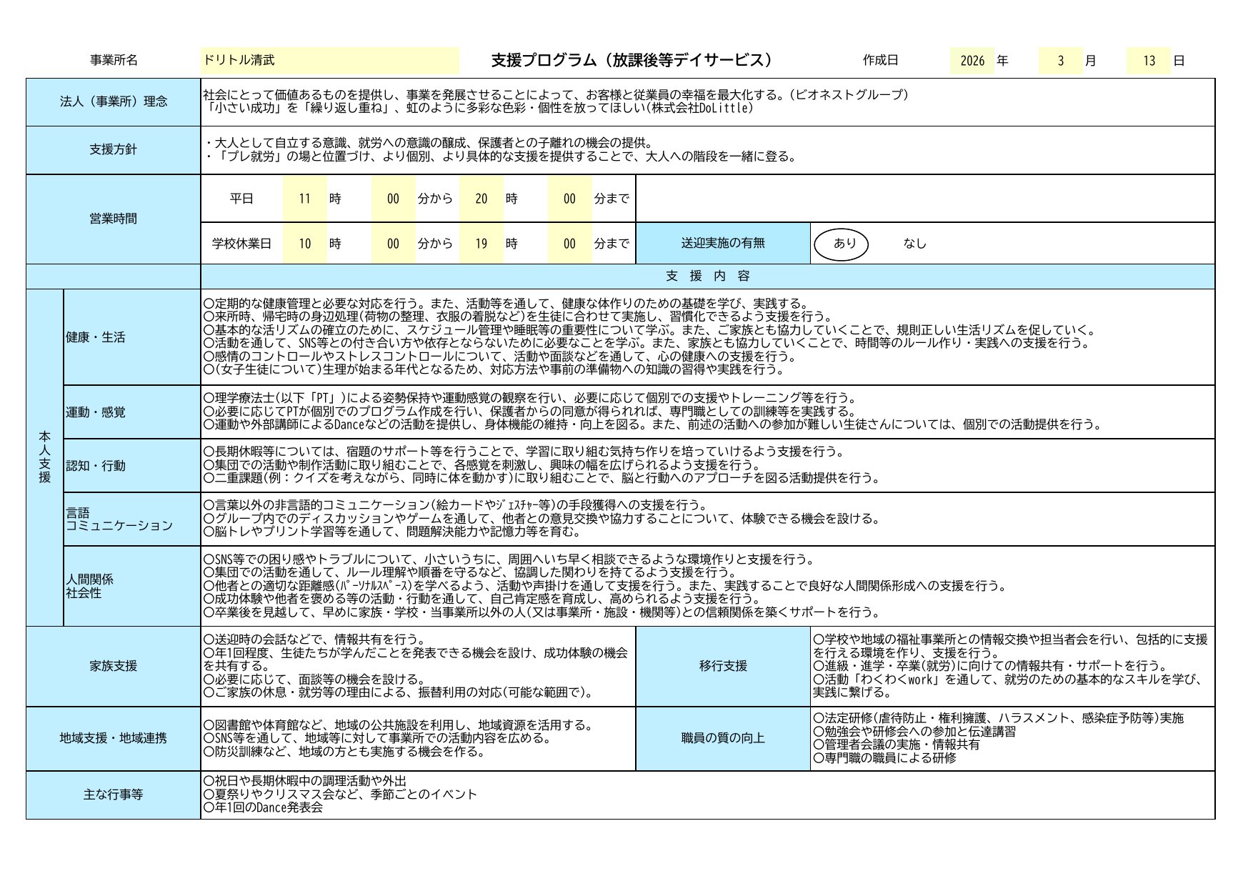 | サービス提供時間 | 午前10時〜午後6時 長期休暇中は午後17時までサービス提供 |